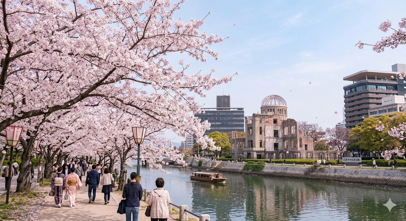 หนึ่งในสถานที่ยอดนิยมคือ สวนสันติภาพฮิโรชิม่า ซึ่งในช่วงฤดูใบไม้ผลิจะเต็มไปด้วยต้นซากุระที่บานสะพรั่ง สร้างบรรยากาศสงบและงดงาม